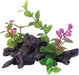 An artificial green and pink plant on replica driftwood. Ideal for any tropical or coldwater aquarium.